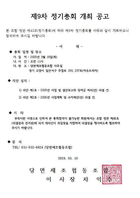제 9차 정기총회 개최 공고